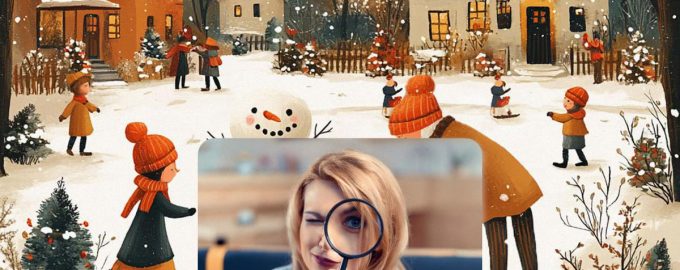 Spodaj si boste ogledali sliko zasneženega trga, po katerem se sprehajajo ljudje. Nekdo se igra s snežnimi kepami, nekdo dela snežaka ali preprosto občuduje zimsko pokrajino.