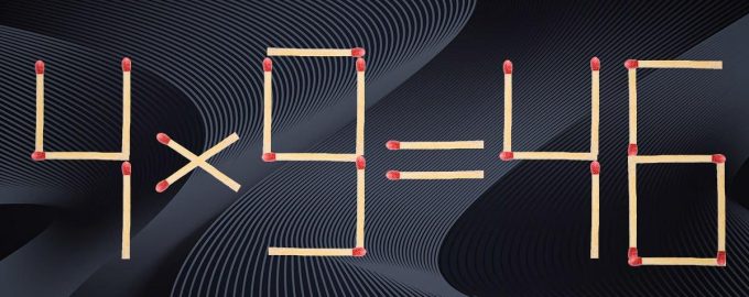 Spodaj je prikazana slika, na kateri je primer z ugankami. Na njej je zapisano, da 4 krat 9 pomeni odgovor 46. Tvoja naloga je, da premakneš le dve vžigalicah v tem primeru, da bo postal pravilen.