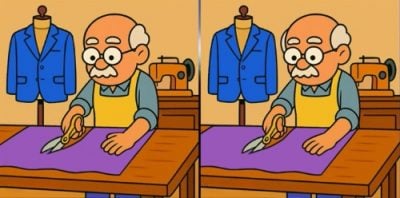 V drugi vizni uganki morate poiskati tri razlike med dvema ilustracijama, ki prikazujeta dedka tatiča, ki s škarjami reže blago, piše jagranjosh.