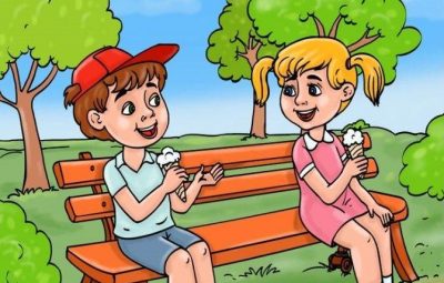 Na sliki vidimo dečka in deklico, ki sedita na klopci v parku in jesta sladoled. V ozadju vidimo drevesa z velikimi zelenimi krošnjami. Vremenske razmere, ki so prikazane na sliki, nakazujejo, da se dogajanje odvija poleti.