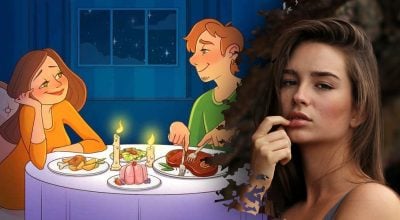 Na sliki vidimo romantično večerjo zaljubljenega para. Fant in dekle sedita za mizo in se z občudovanjem gledata.