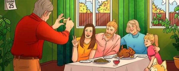 Na naslednji sliki vidimo družino, fotografirano za mizo ob zahvalnem dnevu. Na to, da družina praznuje zahvalni dan, kaže tradicionalni zahvalni puran na mizi.