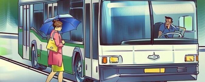 Na sliki vidimo žensko, ki vstopa na avtobus. Zunaj je deževno vreme, zato v rokah drži dežnik, da bi se zaščitila pred padavinami.