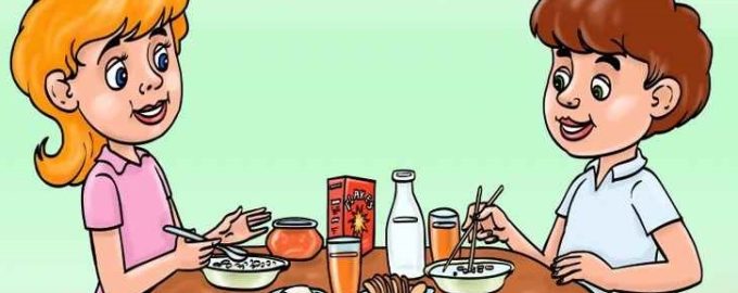 Na sliki vidimo dekle in fanta, ki sedita za mizo in jesta, medtem ko se o nečem strastno pogovarjata.