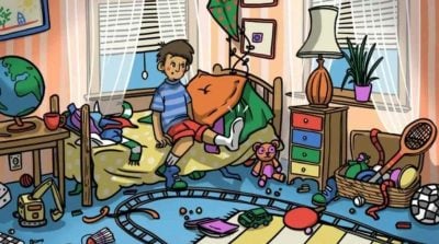 Na sliki je fant v sobi, v kateri je veliko različnih stvari. Išče, kam je izginil čevelj. Naša naloga je najti čevelj.