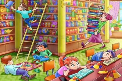 Na sliki vidimo knjižnico, v kateri nekateri otroci berejo knjige, drugi pa igrajo družabne igre. Knjižničarka nosi veliko število knjig, ki jih mora postaviti na police.