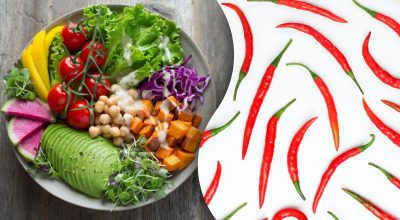 Fotografija prikazuje poln krožnik, na katerem so narezana in cela zelenjava, zelenjava in stročnice. Toda tako obilen krožnik skriva eno “presenečenje” – nekje na njem se skriva paprika čilija, ki jo je skoraj nemogoče opaziti.