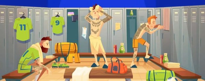 Zdaj si oglejte zgornjo sliko. Videli boste tri osebe v garderobi. Videti je, kot da so pravkar končali nogometno tekmo. Eden od moških na sliki je še vedno v svoji uniformi, drugi se preoblači, tretji pa je pravkar stopil iz tuša in se zavil v brisačo.