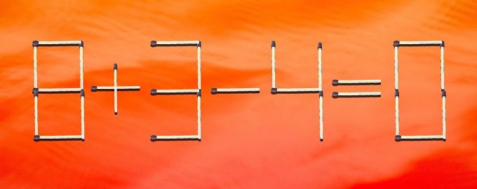 Pred vami je primer 8+3-4=0=0, ki je očitno napačen. Da bi bil problem smiseln, lahko premakneš le eno uganko. V skladu s pravili takšnih ugank ne smete odstraniti paličice iz znaka “=” ali ga prečrtati, lahko pa spremenite vse druge simbole in številke.