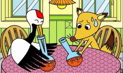 Na sliki vidimo prizor iz znane pravljice o lisici in žerjavici. Medtem ko žerjav veselo uživa hrano iz ozke bučke, lisica le zavistno pogleduje v posodo, iz katere ne more dobiti okusne hrane.