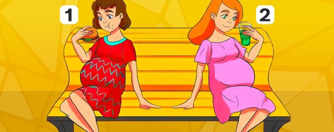 Na sliki sta dve ženski, ki sedita na klopi in prigrizujeta. Eno dekle je burger, druga pa pije koktajl. Le ena od njiju je noseča.. Samo na podlagi prikazanih informacij moramo ugotoviti, katera od njih je noseča.