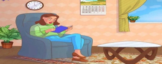 Na sliki vidimo dekle, ki sedi v fotelju in bere knjigo. Pred njo je mizica s stekleno površino.