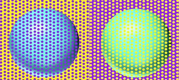Žogice se zdijo različne, ker je leva žogica obdana z vijoličnimi pikami na rumeni podlagi, desna žogica pa je obdana z rumenimi pikami na vijolični podlagi.