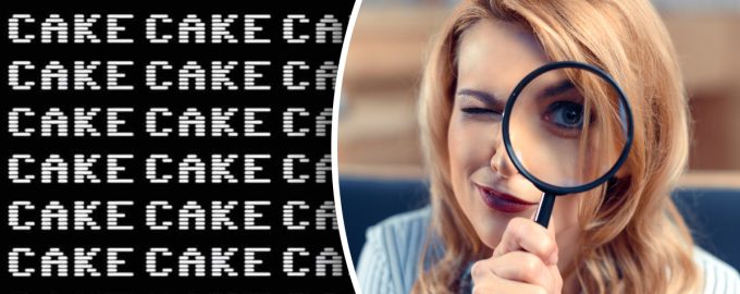 Na sliki vidimo veliko število angleških besed cake, ki jih prevedemo kot “torta, torta”. Toda nekje med njimi se skriva še ena beseda, ki je ne bi smelo biti na tem seznamu.