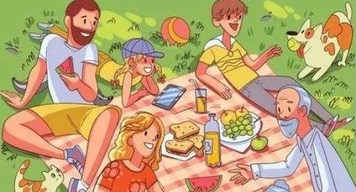 Vidimo družino, ki se zabava v naravi, na pikniku. Babica in dedek, mama in oče ter otroci se pogovarjajo, uživajo v naravi in uživajo okusno hrano.